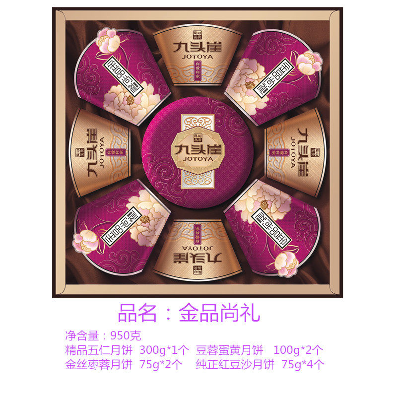 九头崖金品尚礼配置: 75g纯正红豆沙4块 75g金丝枣蓉2块 100g豆蓉蛋黄2块 300g精品五仁1块